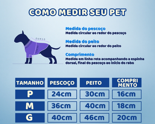 ⚠️ Importante: Meça cuidadosamente o seu pet antes de escolher o tamanho, garantindo que o peitoral fique ajustado de forma confortável e seguro.